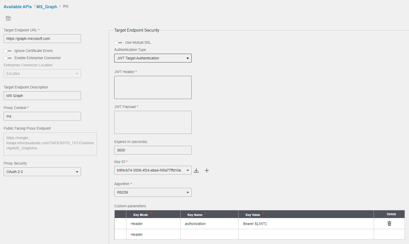 I have been able to complete step #1 using the client_credentials grant type, from an ION API call in a workflow. I am then trying to pass that token as a parameter: Header- Authorization: Bearer [token], to the next ION API step in the workflow, which is just a GET against the planner endpoint. In your case, you are using a BOD, but I am simply trying to call a GET MS Graph API to retrieve json data and map to workflow parameters for next steps.It seems like I am unable to override the Authorization header. Is that possible without a BOD, using policy?