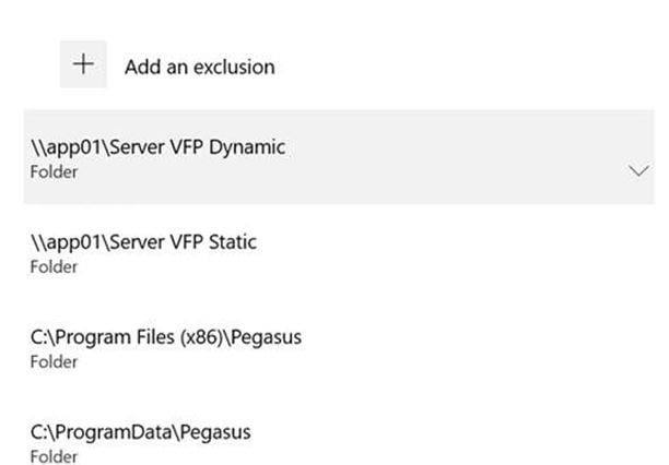 The hosted desktops are running windows 10, previously the Webroot AV was removed from this and its now currently running the windows 10 in built AV (Defender) with the exclusions detailed below