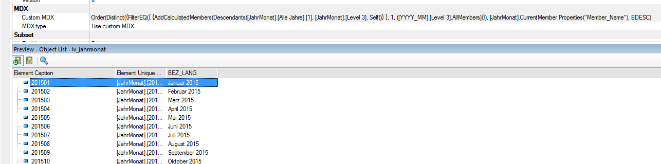 Distinct({FilterEQ({ {AddCalculatedMembers(Descendants([JahrMonat].[Alle Jahre].[1], [JahrMonat].[Level 3], Self))} }, 1, ([YYYY_MM].[Level 3].AllMembers))})