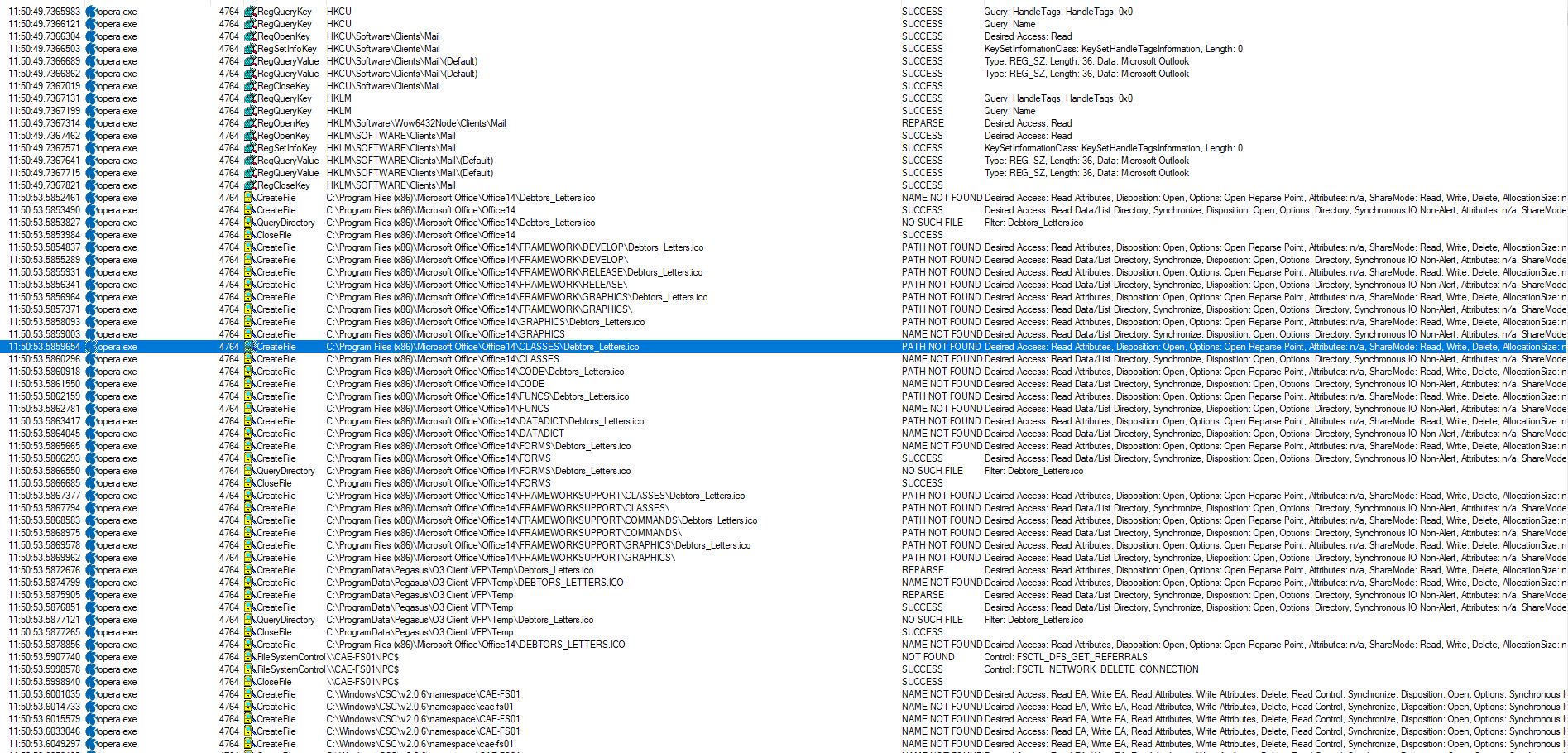 We ran ProcMon on the computer and luckily captured the issue. When it errors it is trying to find opera icon files in C:Program Files (x86)Microsoft OfficeOffice14 instead of C:Program Files (x86)PegasusO3 Client VFP.